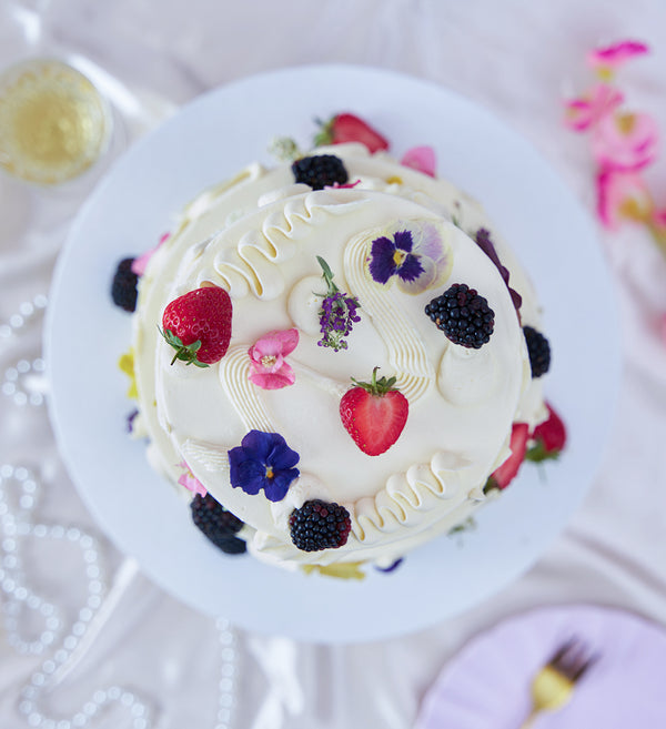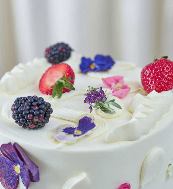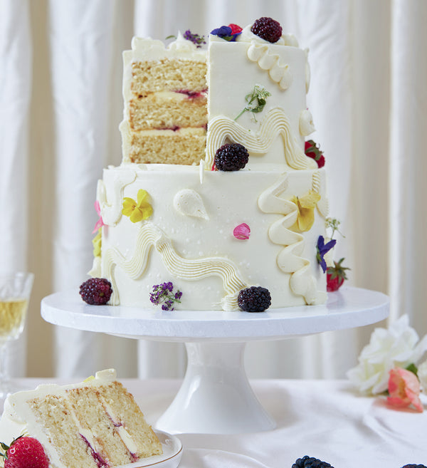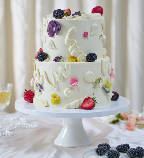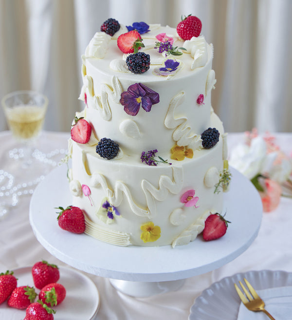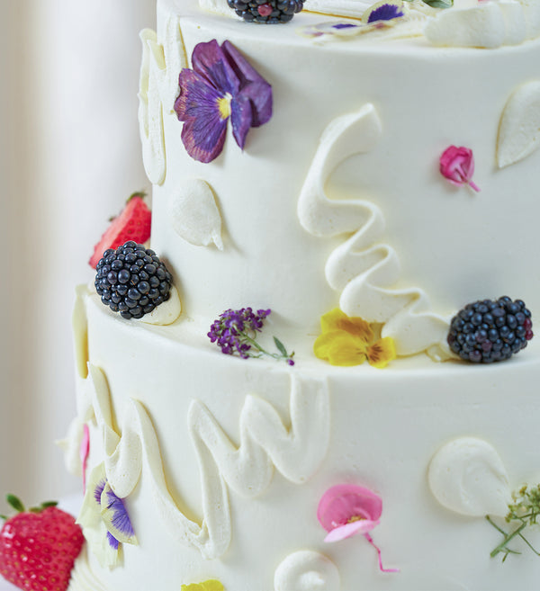 Embrace the abstract with this simply stunning chaos cake. Decorated with white vanilla buttercream, playful swirls of buttercream, an assortment of fresh fruit and delicate edible flowers.