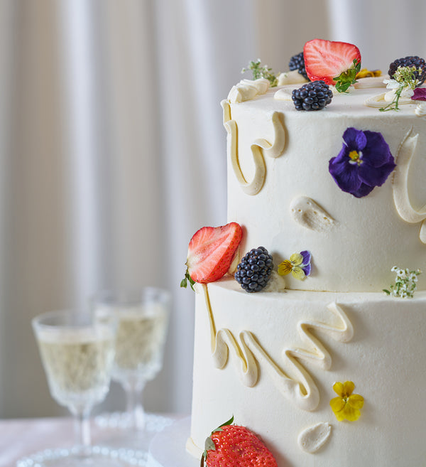 Embrace the abstract with this simply stunning chaos cake. Decorated with white vanilla buttercream, playful swirls of buttercream, an assortment of fresh fruit and delicate edible flowers.