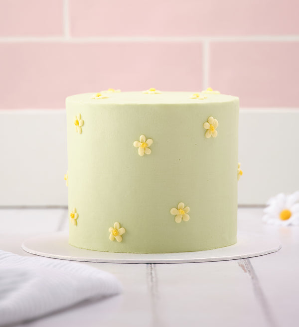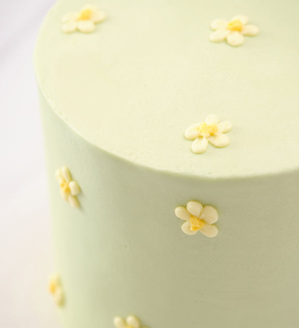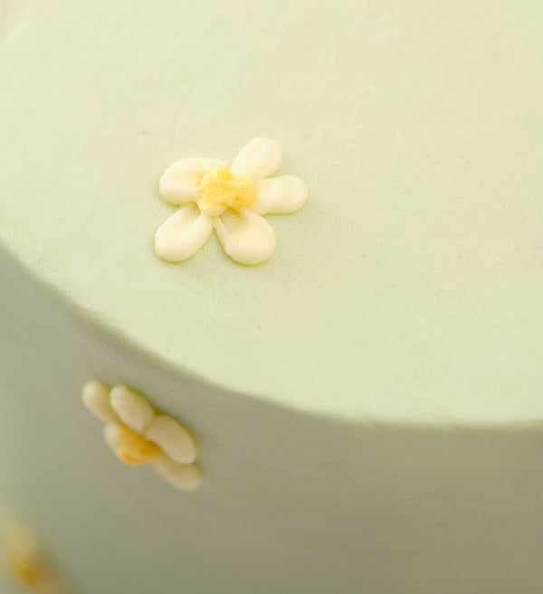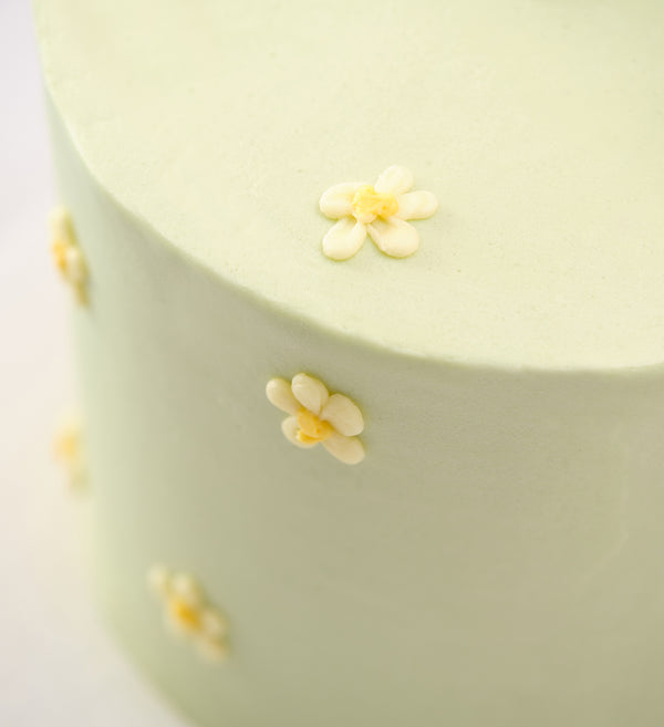 A cake almost too cute to eat! This mini (but tall!) cake is decorated with the perfect sage green vanilla buttercream and finished with delicate hand-piped buttercream daisies.
