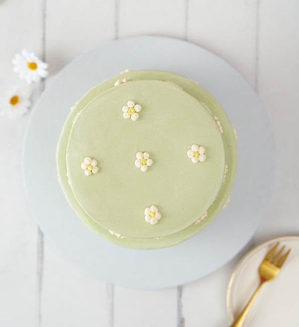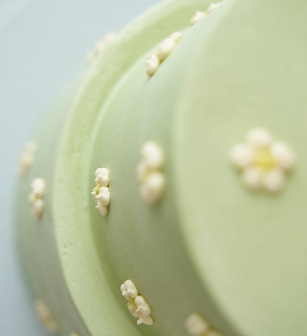 A cake almost too cute to eat! This mini two tier cake is decorated with the perfect sage green vanilla buttercream and finished with delicate hand-piped buttercream daisies.