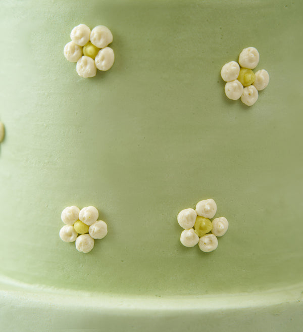 A cake almost too cute to eat! This mini two tier cake is decorated with the perfect sage green vanilla buttercream and finished with delicate hand-piped buttercream daisies.