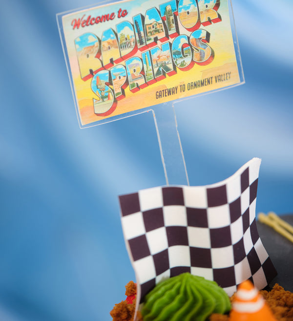 Start your engines and indulge in a high-speed treat with our Disney and Pixar Cars inspired cake! Decorated with smooth red vanilla buttercream and piped green cacti. Topped with sugar paste tyres, chequered race flags, Radiator Springs sign and finished with a toy Lightning McQueen!