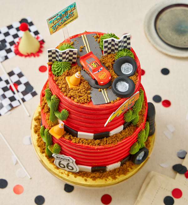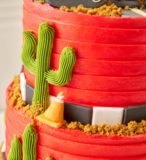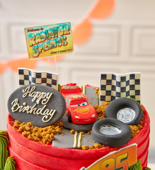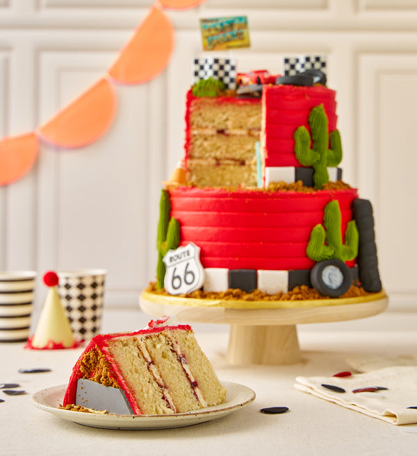 Start your engines and indulge in a high-speed treat with our Disney and Pixar Cars inspired cake! Decorated with smooth red vanilla buttercream and piped green cacti. Topped with sugar paste tyres, chequered race flags, Radiator Springs sign and finished with a toy Lightning McQueen!