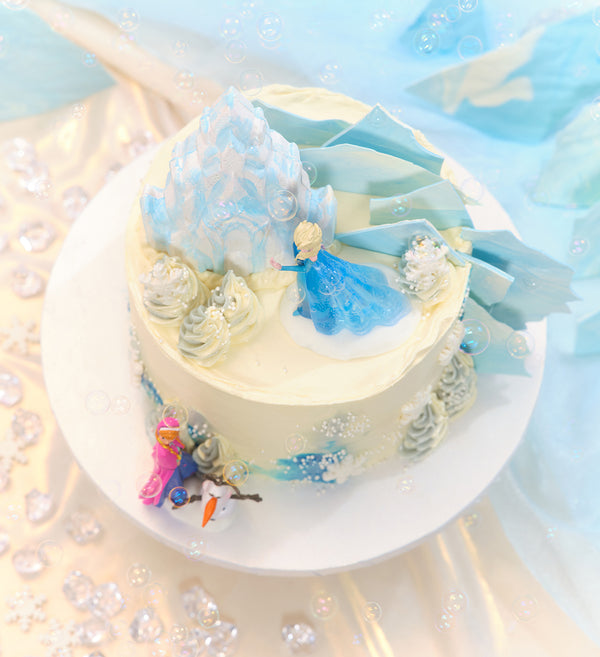 Embrace the icy magic with our Disney Frozen inspired cake. This is a true celebration showstopper, topped with an intricate white chocolate castle, piped buttercream trees, white chocolate shards and snowflakes. Finished perfectly with an Elsa toy.