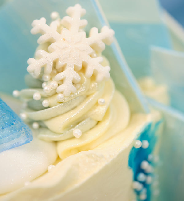 Embrace the icy magic with our Disney Frozen inspired cake. This is a true celebration showstopper, topped with an intricate white chocolate castle, piped buttercream trees, white chocolate shards and snowflakes. Finished perfectly with an Elsa toy.