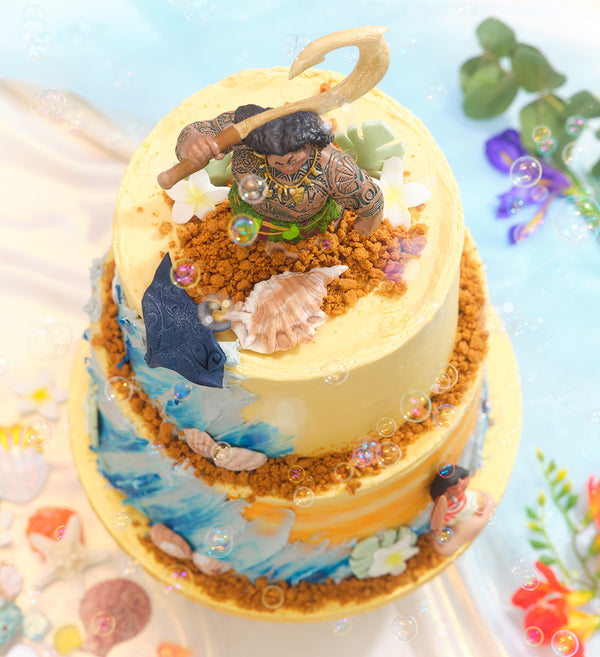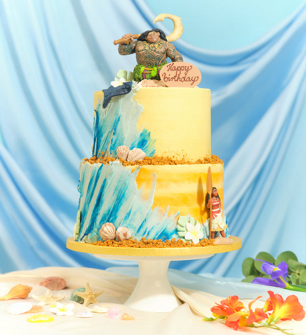 Set sail on a tropical adventure with our Disney Moana inspired cake! This cake features vibrant island-inspired details, from sugar paste tropical flowers and shells to a handcrafted stingray. Topped with Moana and Maui toys (and a little bit of ocean magic), this cake is the perfect centrepiece for any Moana fan’s celebration..