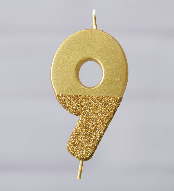 Gold number birthday candle dipped with glitter. Add some sparkle to your birthday cake with this stylish number birthday gold candle cake decoration.