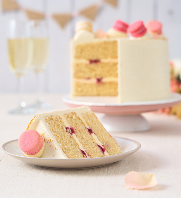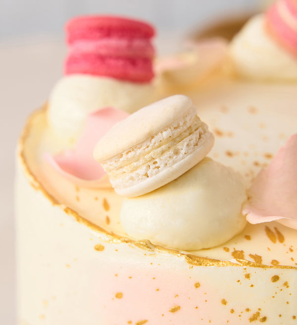 A pastel wedding cake of dreams. Freshly baked sponge layers, handpiped with buttercream and speckled with gold flecks. Crowned with macarons and elegant rose petals.