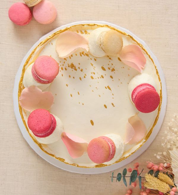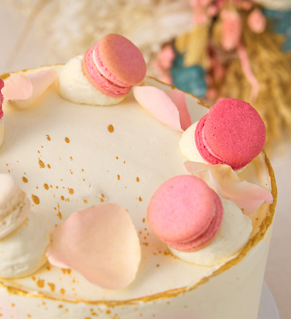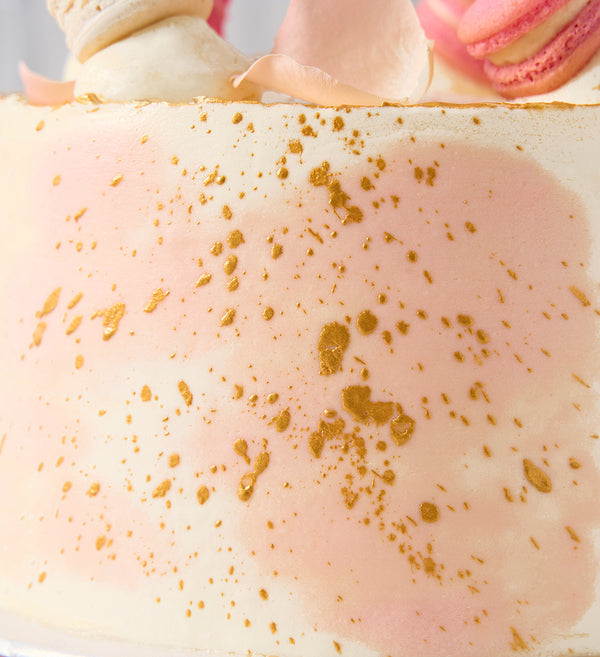 A pastel wedding cake of dreams. Freshly baked sponge layers, handpiped with buttercream and speckled with gold flecks. Crowned with macarons and elegant rose petals.