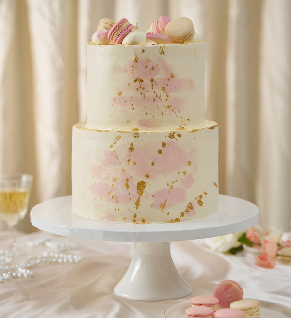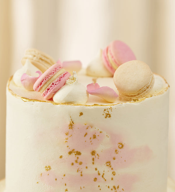 A pastel wedding cake of dreams. Freshly baked sponge layers, handpiped with buttercream and speckled with gold flecks. Crowned with macarons and elegant rose petals.