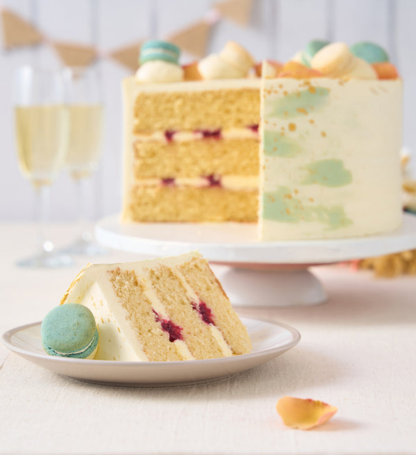 A sage and ivory dream cake. Moist sponge layers, piped with sage and ivory vanilla buttercream and speckled with gold flecks. Crowned with vanilla macarons and delicate rose petals.