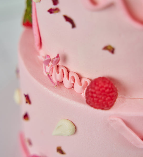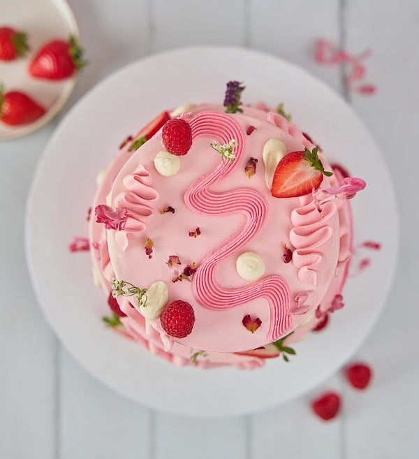 Embrace the abstract with this simply stunning Pink 'Chaos Cake'. Decorated with playful swirls of pink vanilla buttercream, as well as an assortment of fresh fruit and delicate edible flowers.