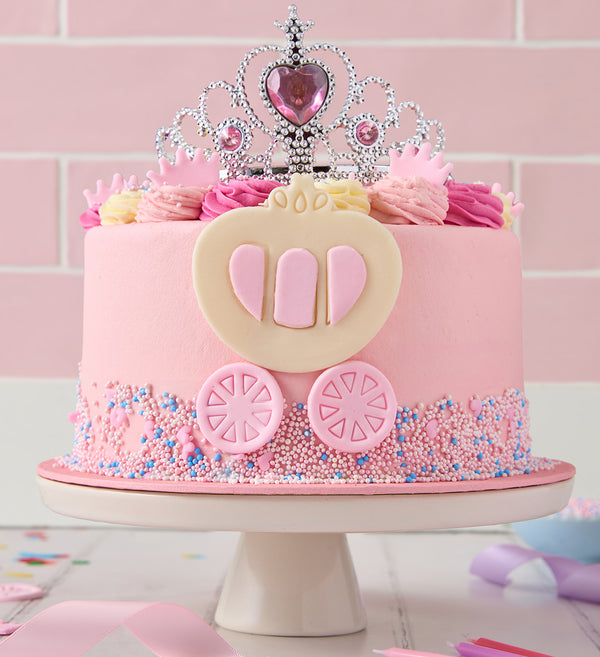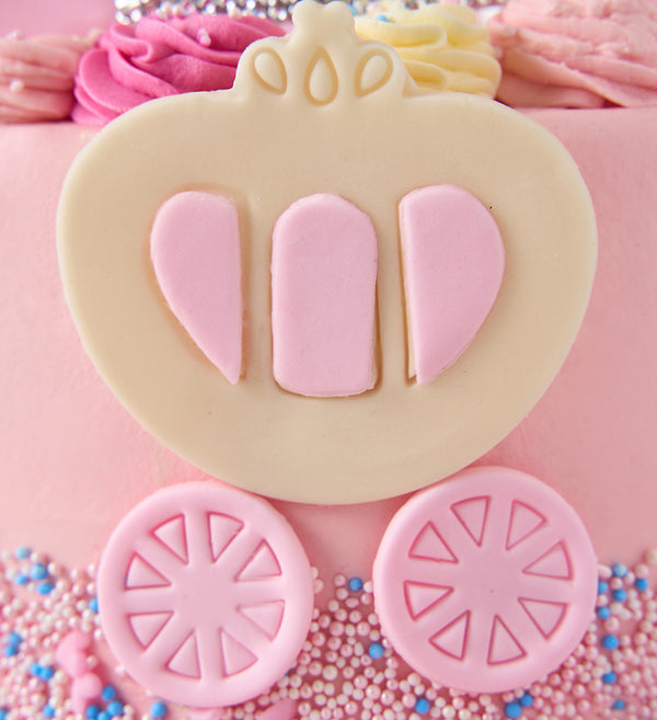 Your carriage has arrived to transport you to an enchanting new world. This cake is fit for a princess! Perfect for kids parties! No artifical colours are used in this cake.