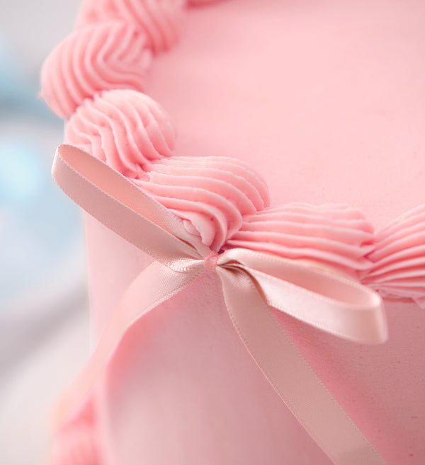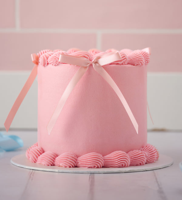 Treat yourself to a slice of simple vintage charm! Decorated with pink vanilla icing and optional matching bows, it’s a nostalgic delight in every bite.
