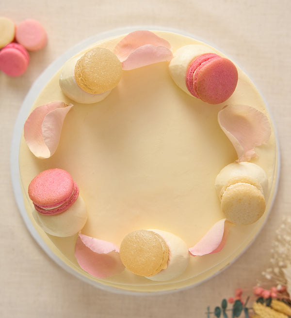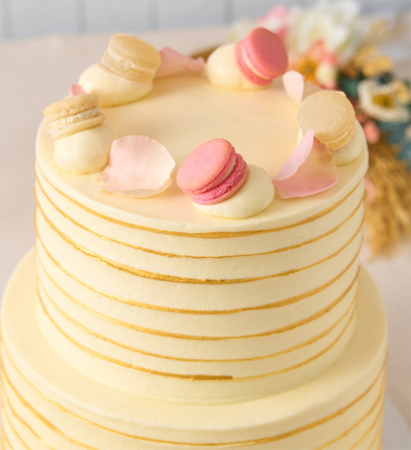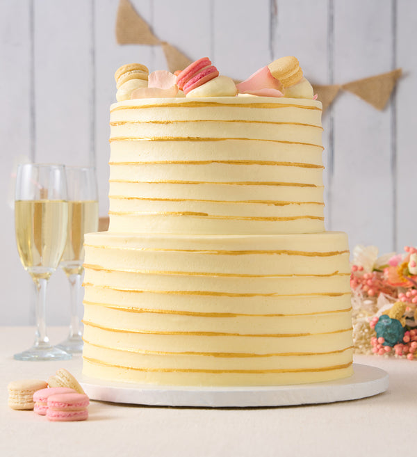 Say 'yes' to a classically beautiful wedding cake. Freshly baked sponge layers paired with ivory vanilla buttercream and hand-painted with gold dust. Crowned with vanilla and rose macarons and delicate rose petals.
