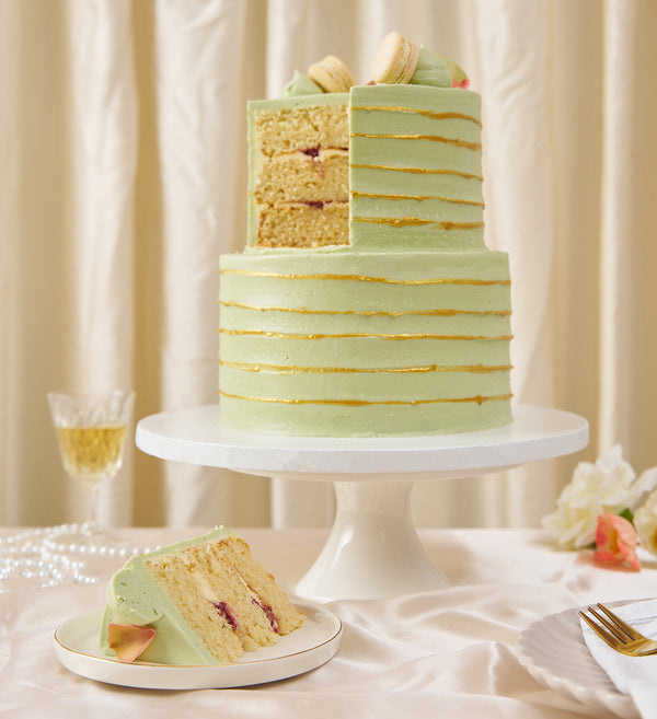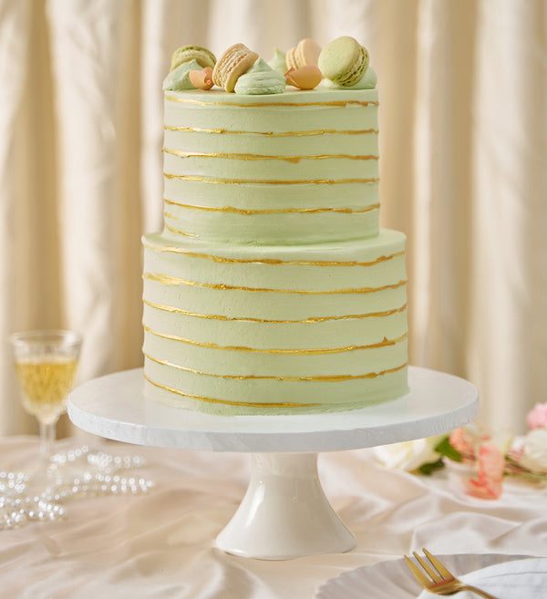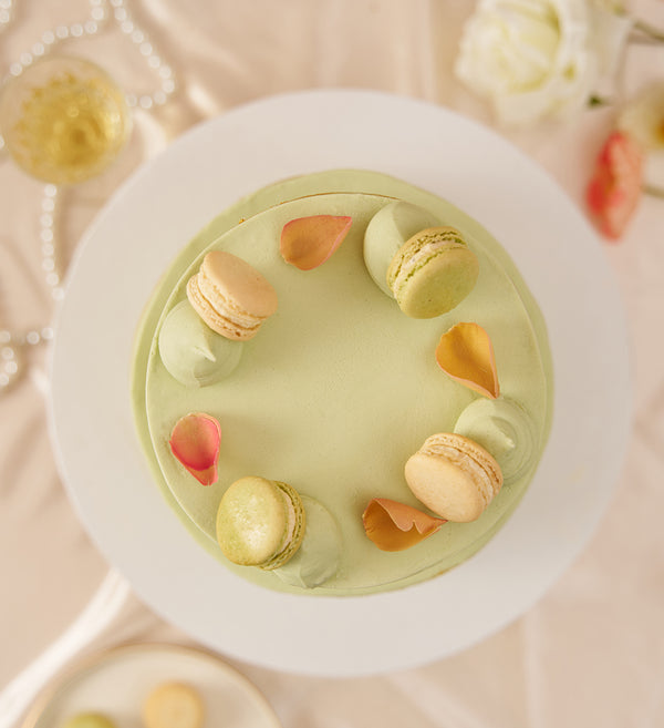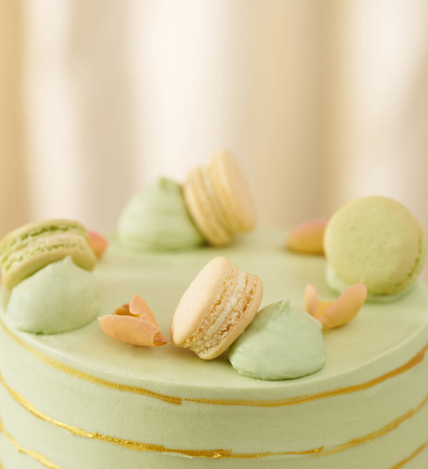 A statement in sage. Freshly baked sponge layers, piped with sage vanilla buttercream and handpainted with gold dust. Crowned with vanilla macarons and delicate rose petals.