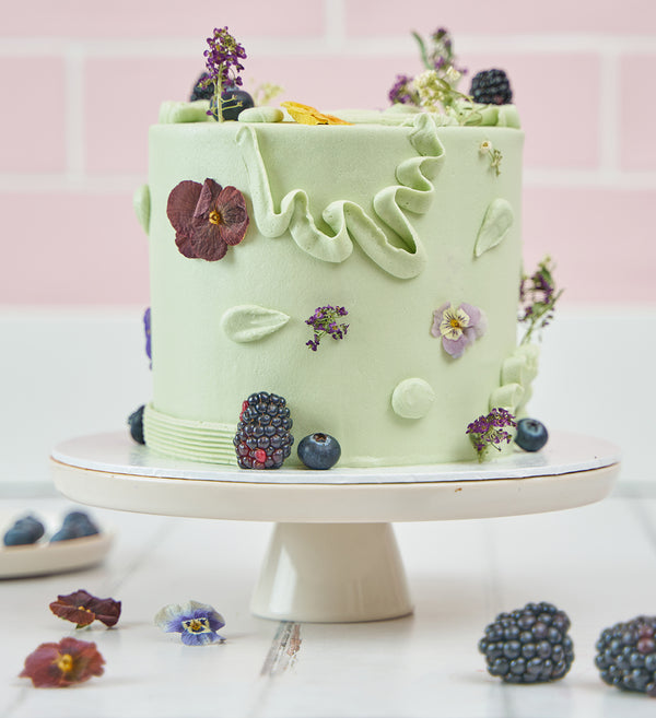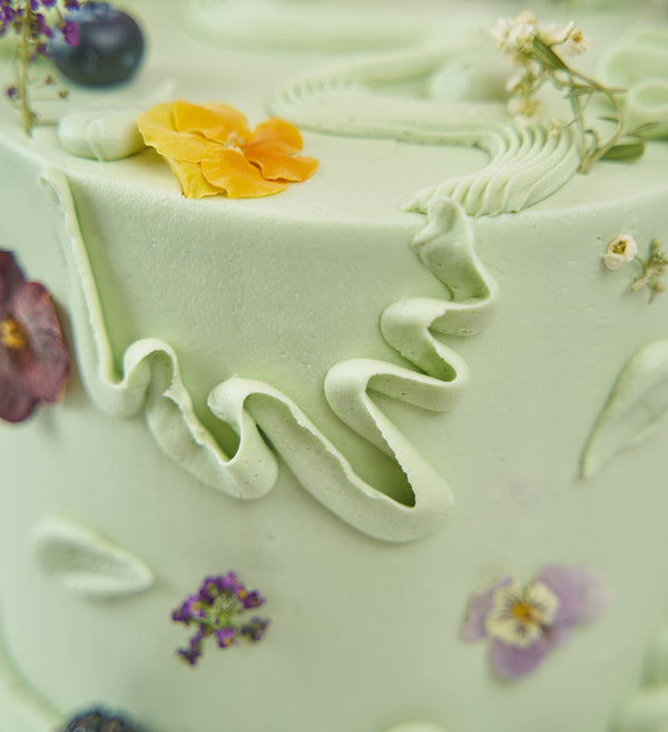 Embrace the abstract with this simply stunning Sage Green 'Chaos Cake'. Decorated with playful swirls of green vanilla buttercream, as well as an assortment of fresh fruit and delicate edible flowers.