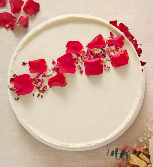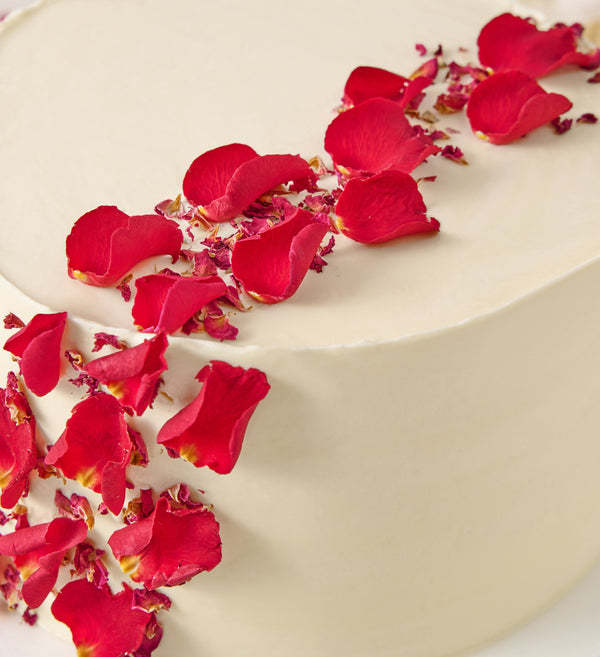 Tie the knot with real rose petals! Layers of delicate sponge in your chosen flavour, hand piped with ivory vanilla buttercream and decorated with sweeping pink rose petals.