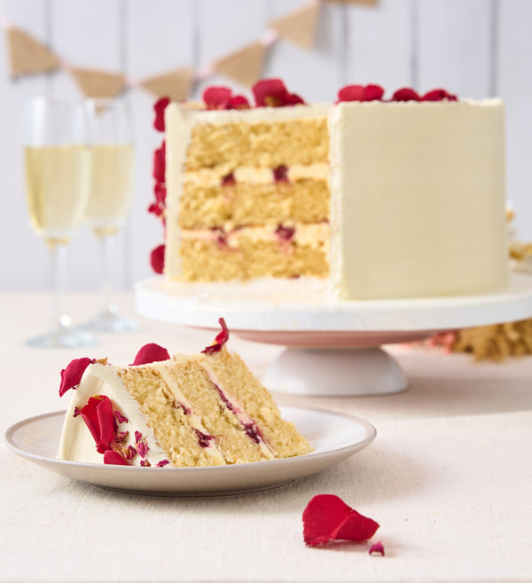 Tie the knot with real rose petals! Layers of delicate sponge in your chosen flavour, hand piped with ivory vanilla buttercream and decorated with sweeping pink rose petals.