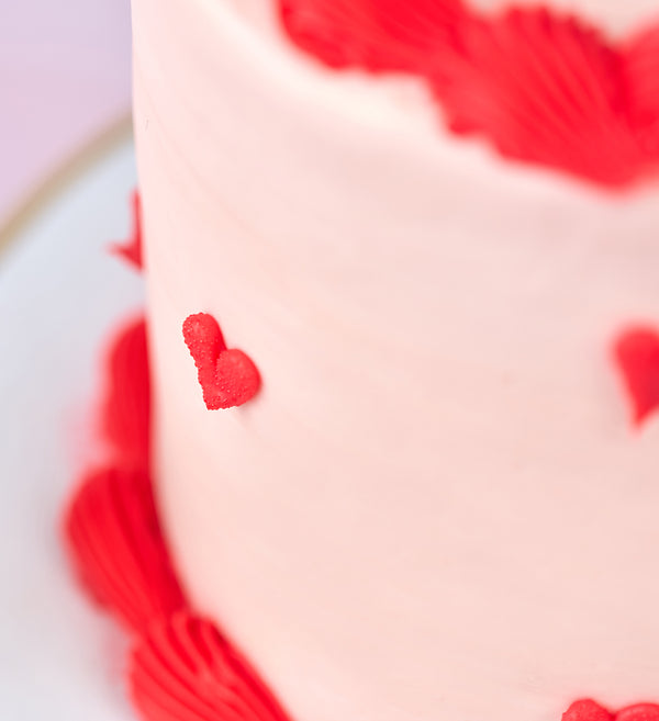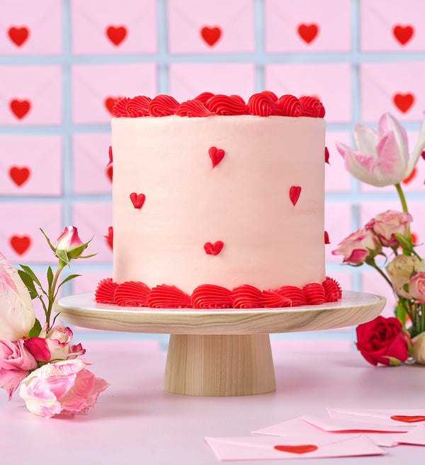 A swoon-worthy centrepiece for your celebration! This elegant mini (but tall!) cake is topped with soft pink vanilla buttercream and finished with red ganache hearts and ruffles.