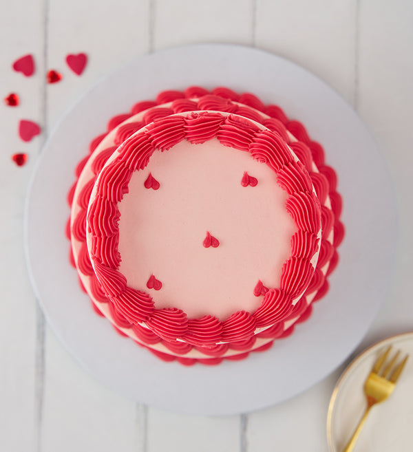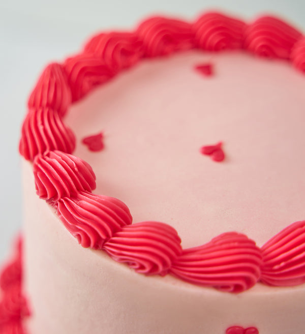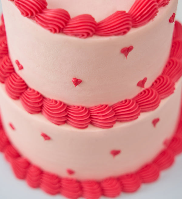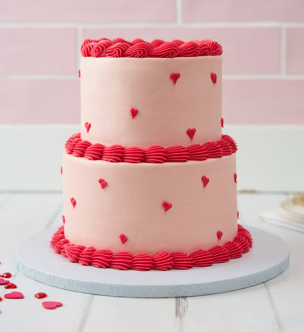 A swoon-worthy centrepiece for your celebration! This elegant mini two tier cake is topped with soft pink vanilla buttercream and finished with red ganache hearts and ruffles.