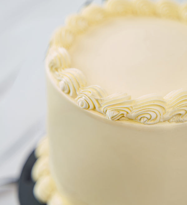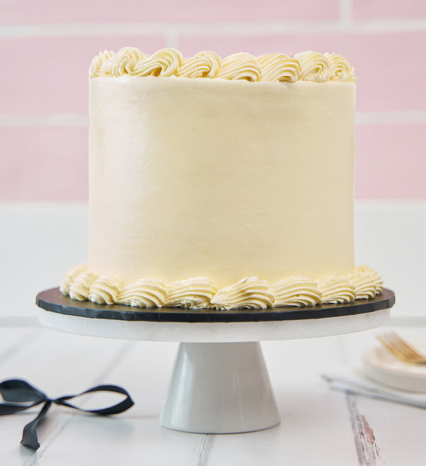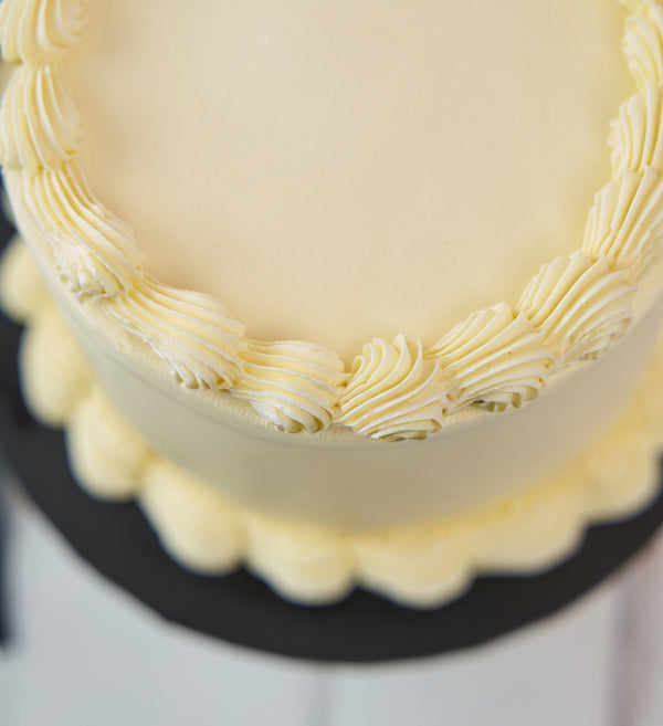 Embrace timeless elegance! Decorated in smooth white buttercream and finished with striking black ribbons, it’s a sophisticated statement in every bite.