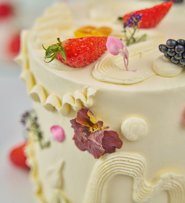Embrace the abstract with this simply stunning chaos cake. Decorated with white vanilla buttercream, playful swirls of buttercream, an assortment of fresh fruit and delicate edible flowers.