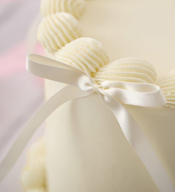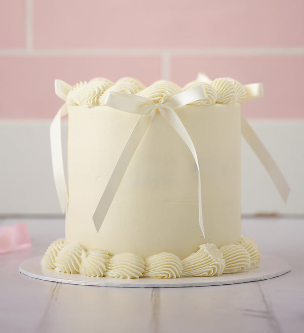 Treat yourself to a slice of simple vintage charm! Decorated with a creamy white vanilla icing and optional matching bows, it’s a nostalgic delight in every bite.